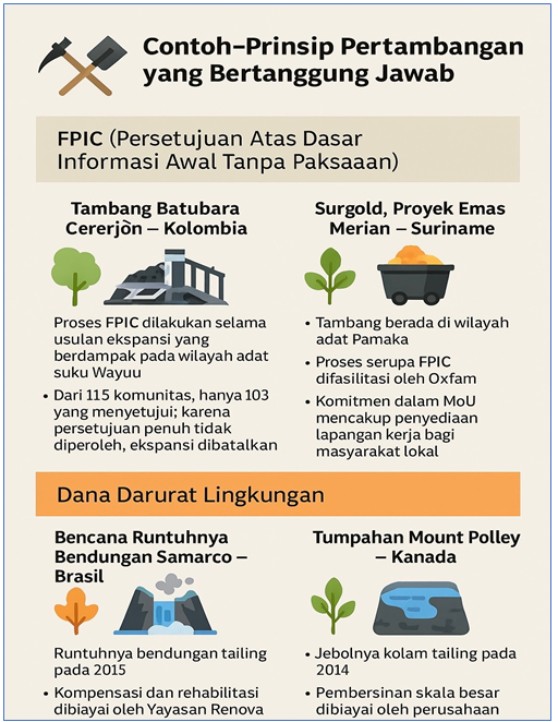 Greenpress Indonesia menilai  praktik pertambangan terbaik yang telah dilakukan di beberapa konsesi tambang  dunia sudah beberapa langkah lebih maju karena mengimplementasikan dua prinsip lainnya, yaitu First Prior Informed Consent (FPIC) sebelum operasi pertambagan, dan adanya kewajiban alokasi Environmental Emergency Fund (EEF) sebagai wujud pertambangan yang bertanggung jawab.